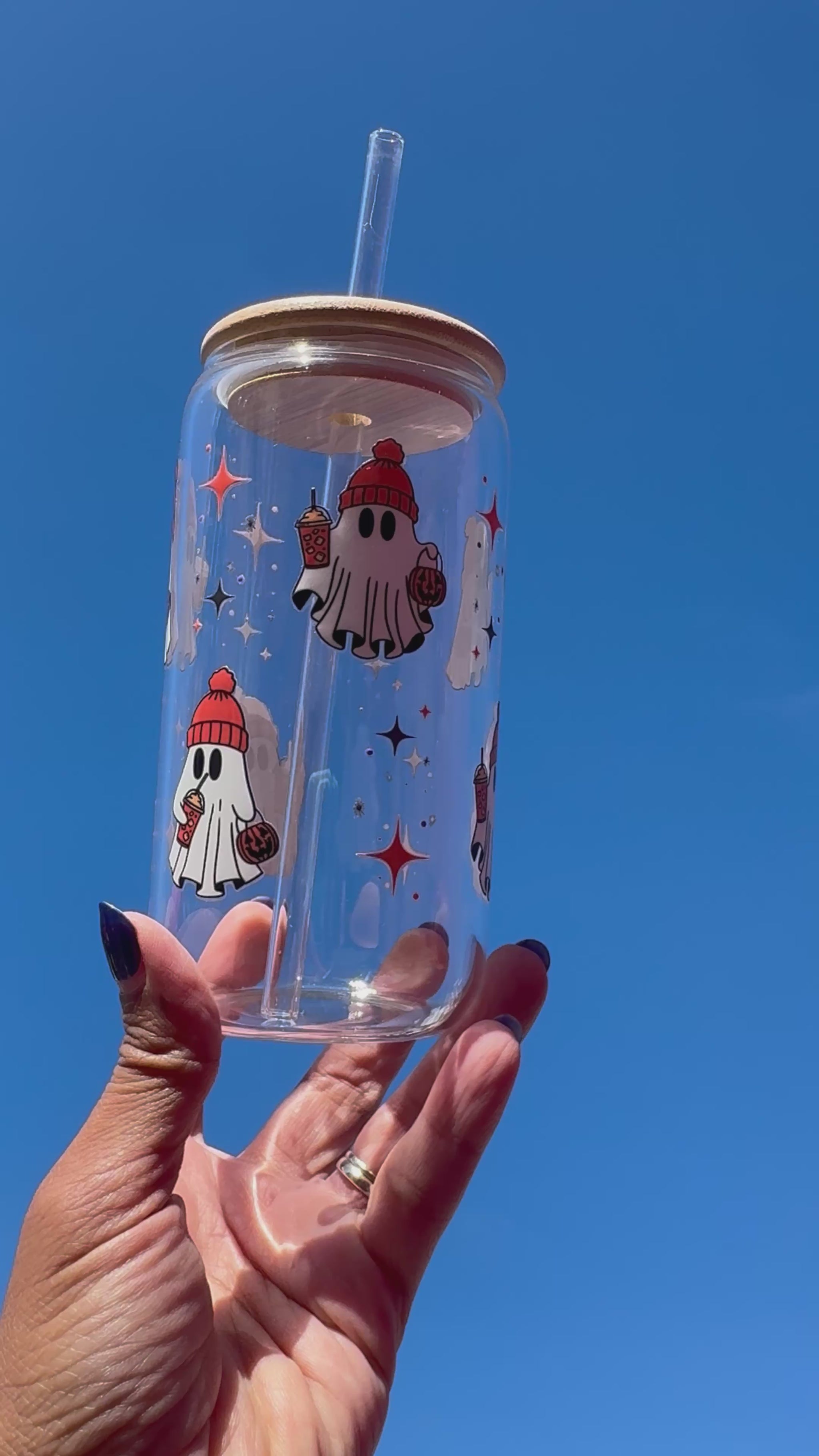 This spooky-cute glass features adorable little ghosts holding pumpkin spice lattes and pumpkin trick-or-treat bags β the perfect blend of cosy autumn vibes and Halloween fun. πβ