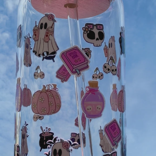 Cute Witchy Glass Can Cup with Bamboo Lid & Straw β Pastel Pink Halloween Aesthetic Tumbler