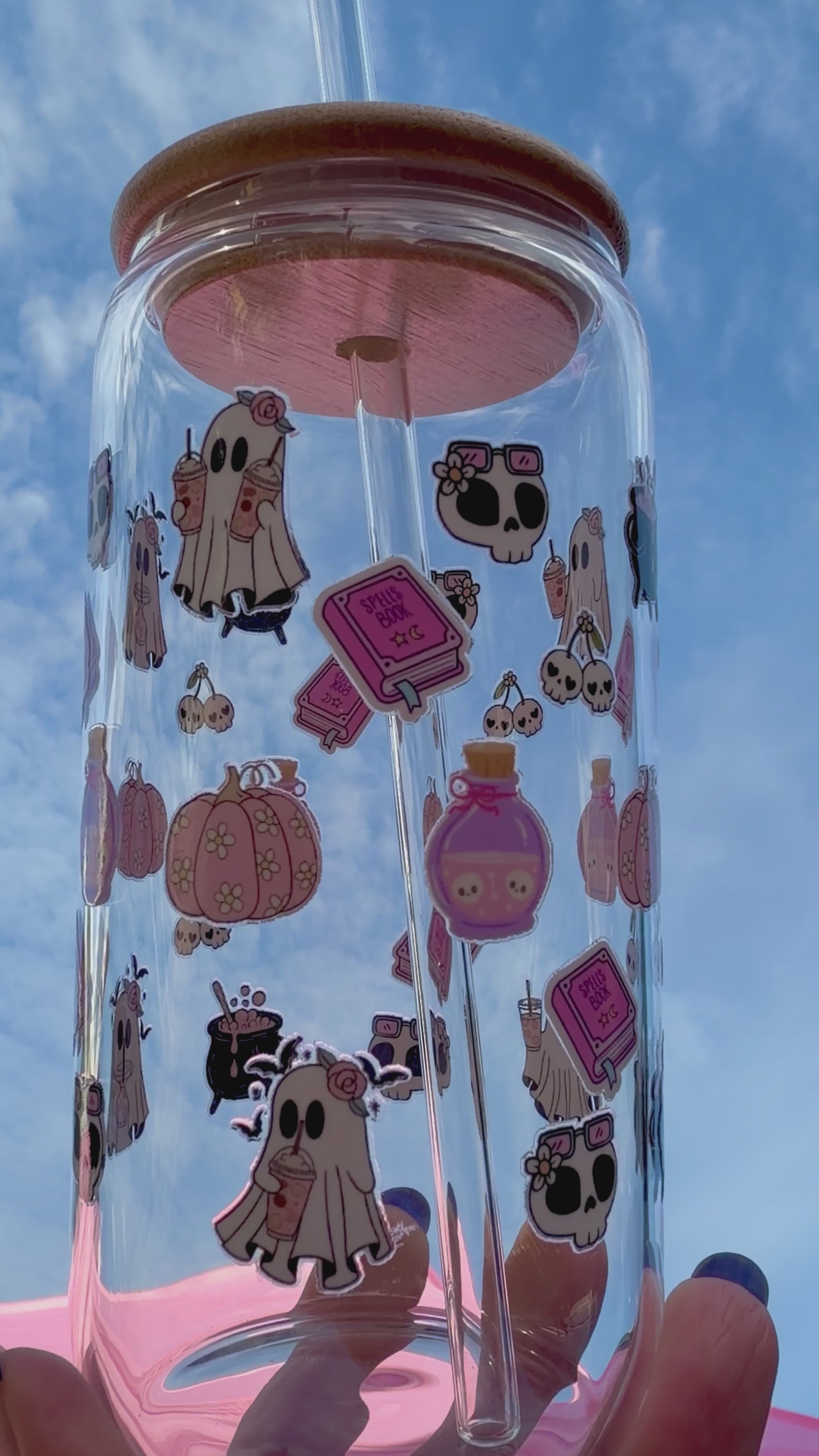 This Cute Witchy Glass Can Cup features pastel pink skulls, cauldrons, potions, and pumpkins β the perfect mix of spooky and sweet. Comes with a bamboo lid and reusable glass straw for eco-friendly sipping. Ideal for iced coffee, matcha, or any magical drink!
