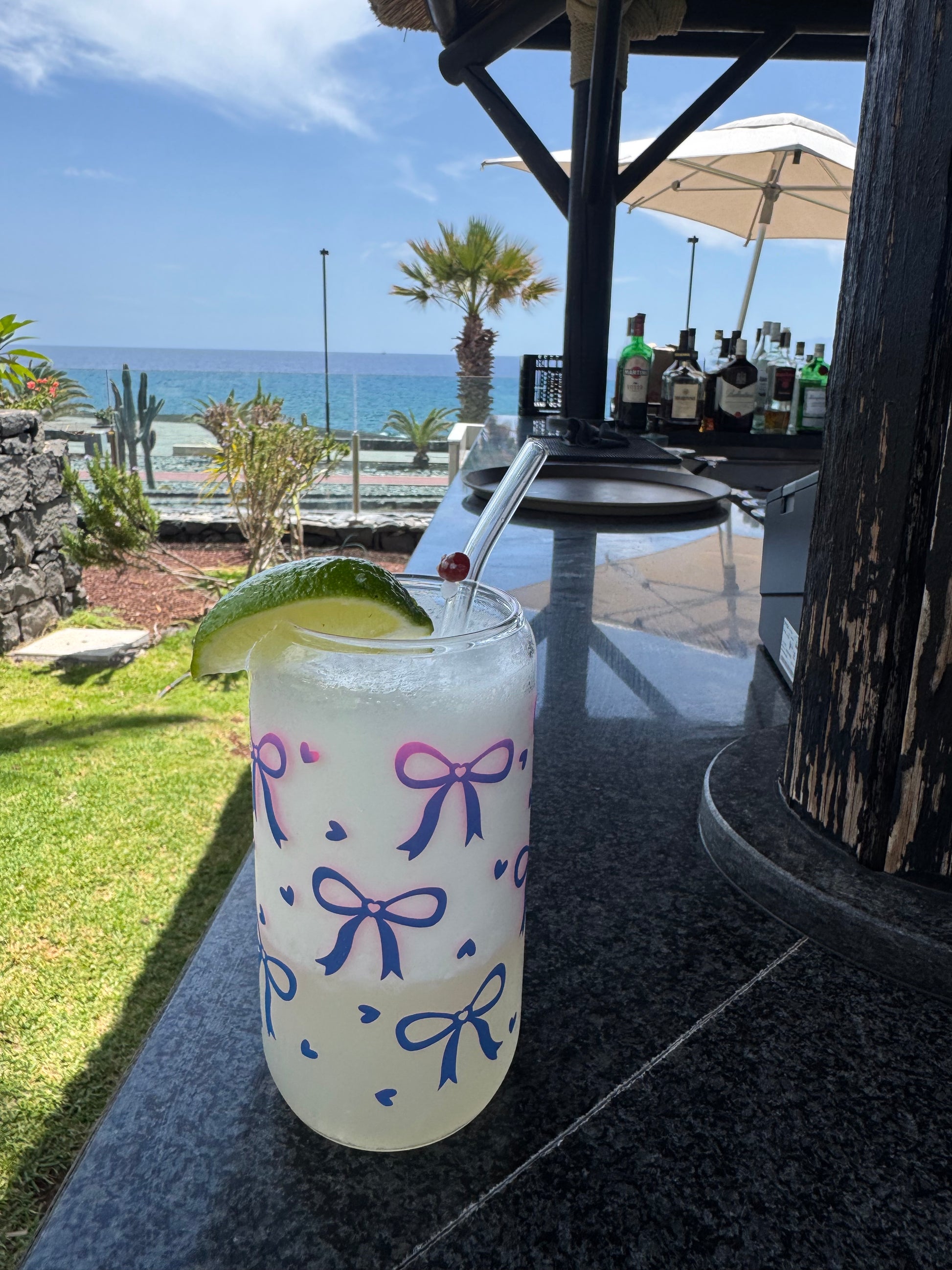 Colour Changing Glass Cup – Pink Bows & Hearts Turn Blue with Cold Drinks